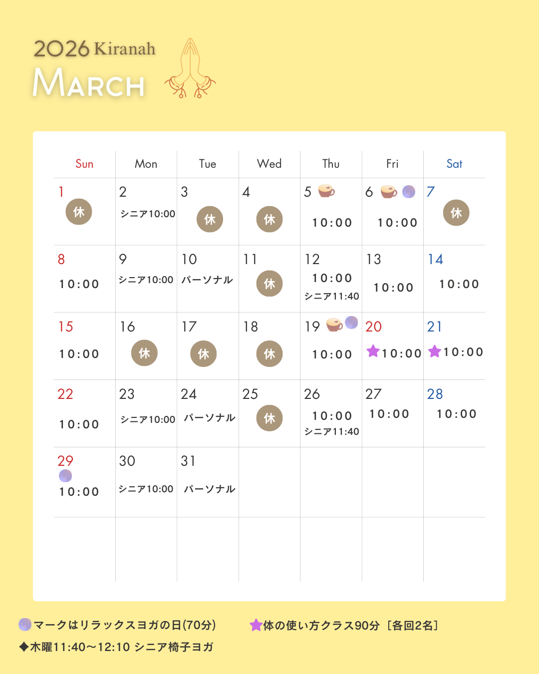3月もヨガの練習を続けて、身体と心を整え、安定させて軽やかに過ごしていきましょう🧘‍♀️
